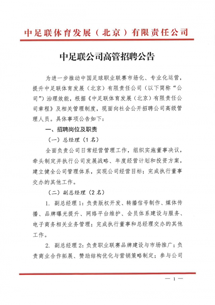 10月09日讯 中国足球劳动联赛麇集会发布高管招聘公告,招聘岗亭为总司理(1名)、副总司理(2名)。