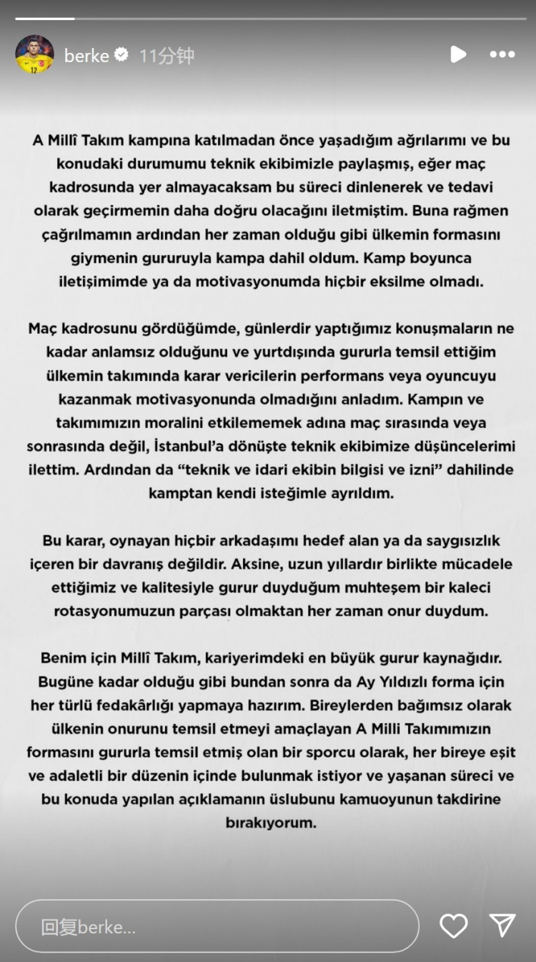 当看到比赛名单时,我才暴露到这些天来的疏导毫无真义——那些在国外为国争气的球员,在国度队决议者眼中,其阐扬和斗志根柢不被宠爱。为幸免影响集训营和球队士气,我遴荐在复返伊斯坦布此后向时期团队传达了我的念念法,而非在比赛时候或赛后,随后在‘时期和照拂团队知情并应许’的情况下,我自发离开了集训营。