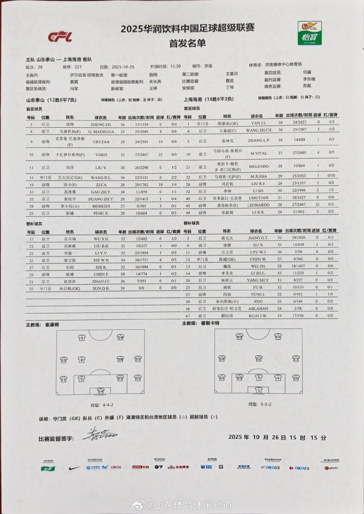 10月26日讯 中超第28轮,山东泰山主场迎战上海海港,比赛左近开球前,泰山首发名单移动,彭啸首发,洛佩斯取消首发。