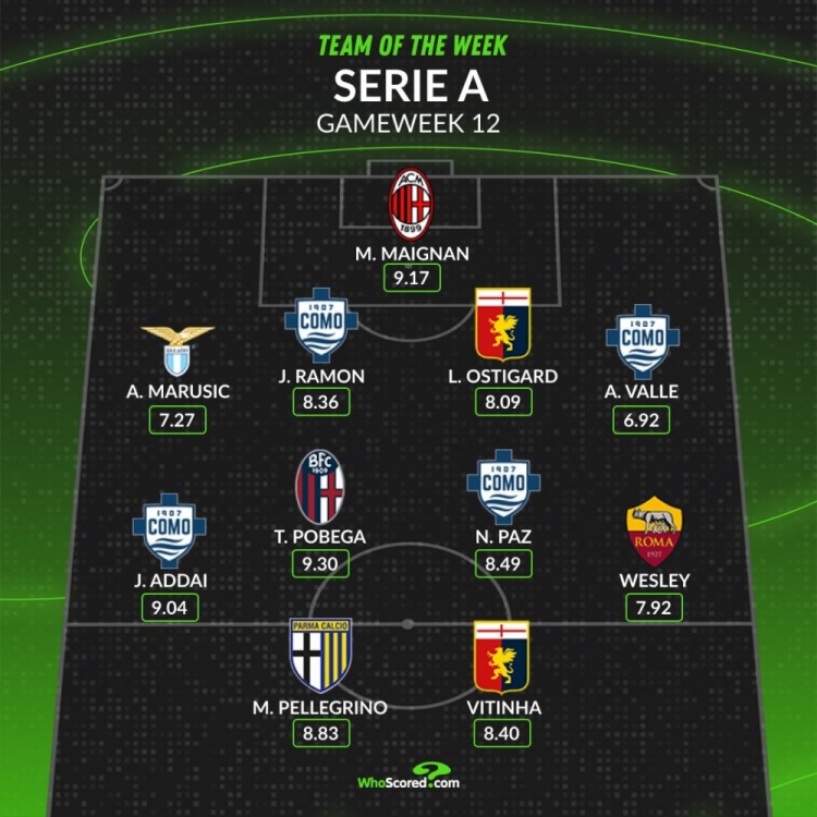 中场:杰登·阿代(科莫,9.04分)、托马索·波贝加(博洛尼亚,9.30分)、尼科·帕斯(科莫,8.49分)、韦斯利·法兰卡(罗马,7.92分)
