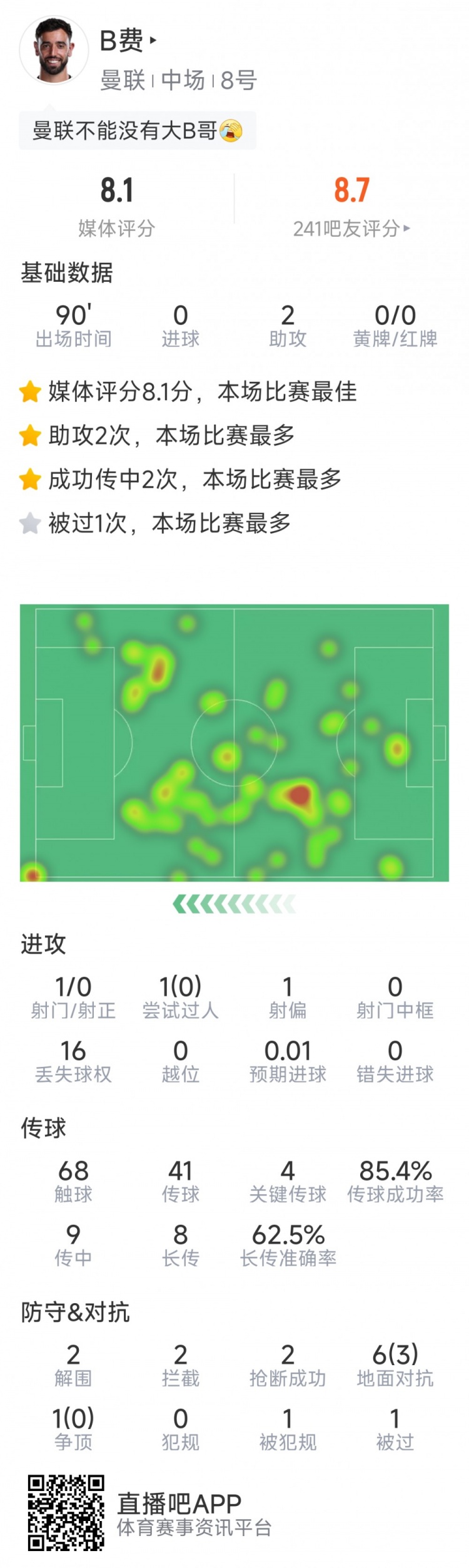 B费本场数据:助攻双响,4次要道传球,1次射门,2抢断、2阻碍