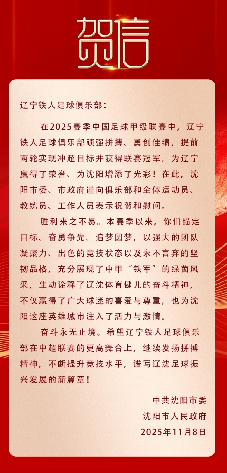 11月9日讯 2025赛季中甲联赛收官,辽宁铁东说念主夺冠并升入中超,沈阳市委市政府致贺信祝福。