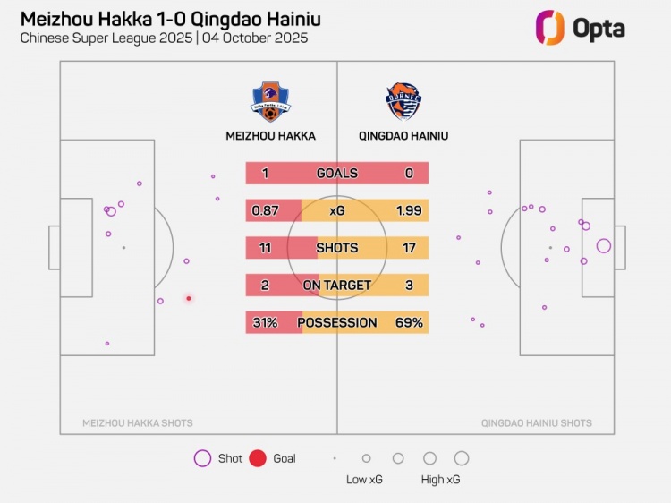 青岛海牛本场的控球率为69%,刷新球队自2012年以来单场中超新高