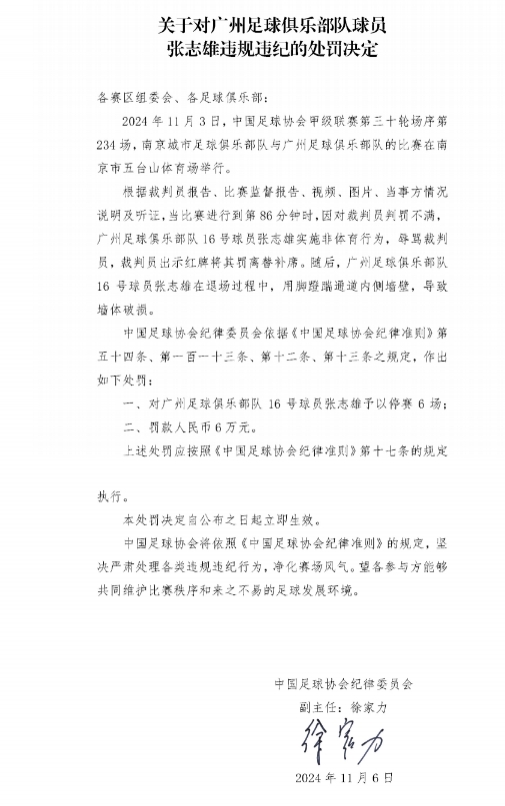 而在这个赛季的收官战中,张志雄再次引起事端。由于对判罚不悦,张志雄作念出曲直裁判的活动,并在退场经过中蹬踹通谈墙体,过后被中国足协科罚停赛6场并罚金6万元东谈主民币。
