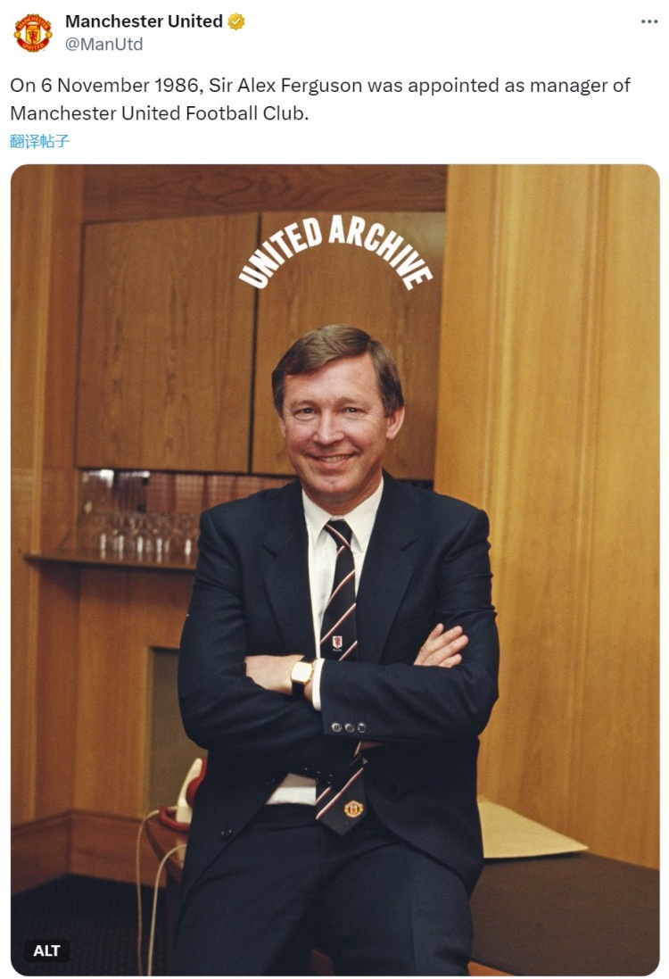 1986年11月6日,弗格森被任命为曼联主帅,曼联官方社媒晒出弗格森的像片,牵记这个畸形的日子。