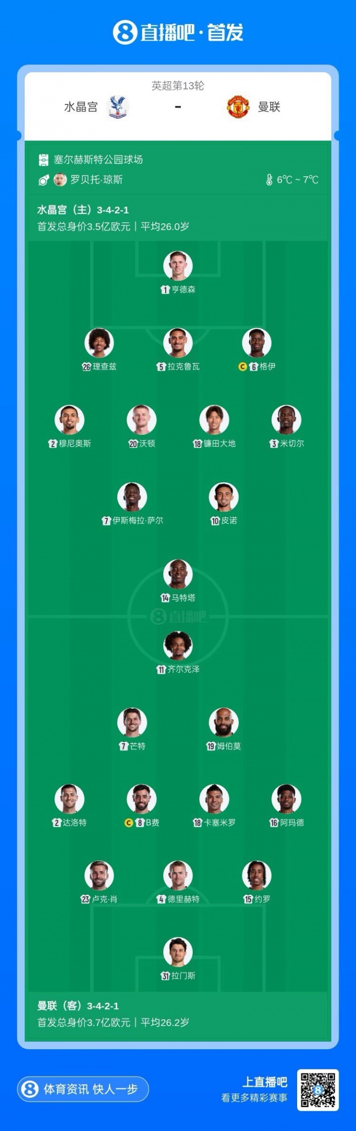 水晶宫首发:1-迪恩-亨德森、2-穆尼奥斯、3-米切尔、5-拉克鲁瓦、6-格伊、26-理查兹、18-镰田地面、20-沃顿、7-伊斯梅拉-萨尔、10-皮诺、14-马特塔