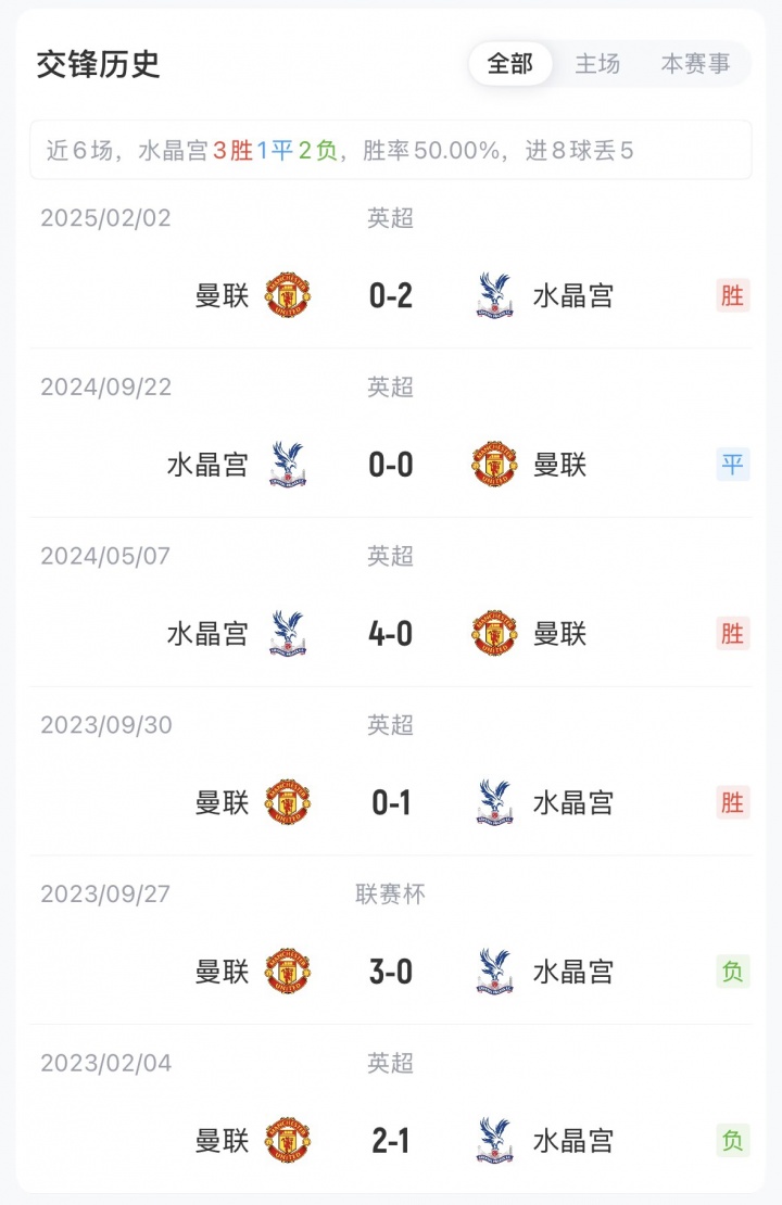 本场赛前,水晶宫5胜5平2负积20分,排行英超第6,曼联5胜3平4负积18分,排行第12。此前曼联在英超中对阵水晶宫已衔接4场不堪。