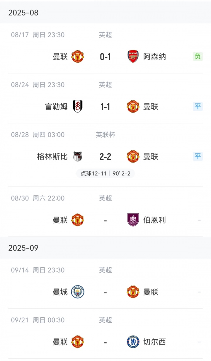 本赛季开赛以来,曼联0-1阿森纳、1-1富勒姆,加上今天的输球,1平2负未始胜绩。