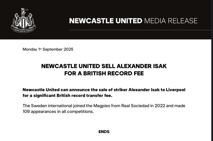 纽卡斯尔官方也发表了伊萨克转会的官方公告,但实质仅37个单词。记者Keith Downie对此评价谈:37个字,献给这位在杯赛决赛中打入致胜一球的球员。这充分泄漏了俱乐部如何看待他本年夏天的活动。