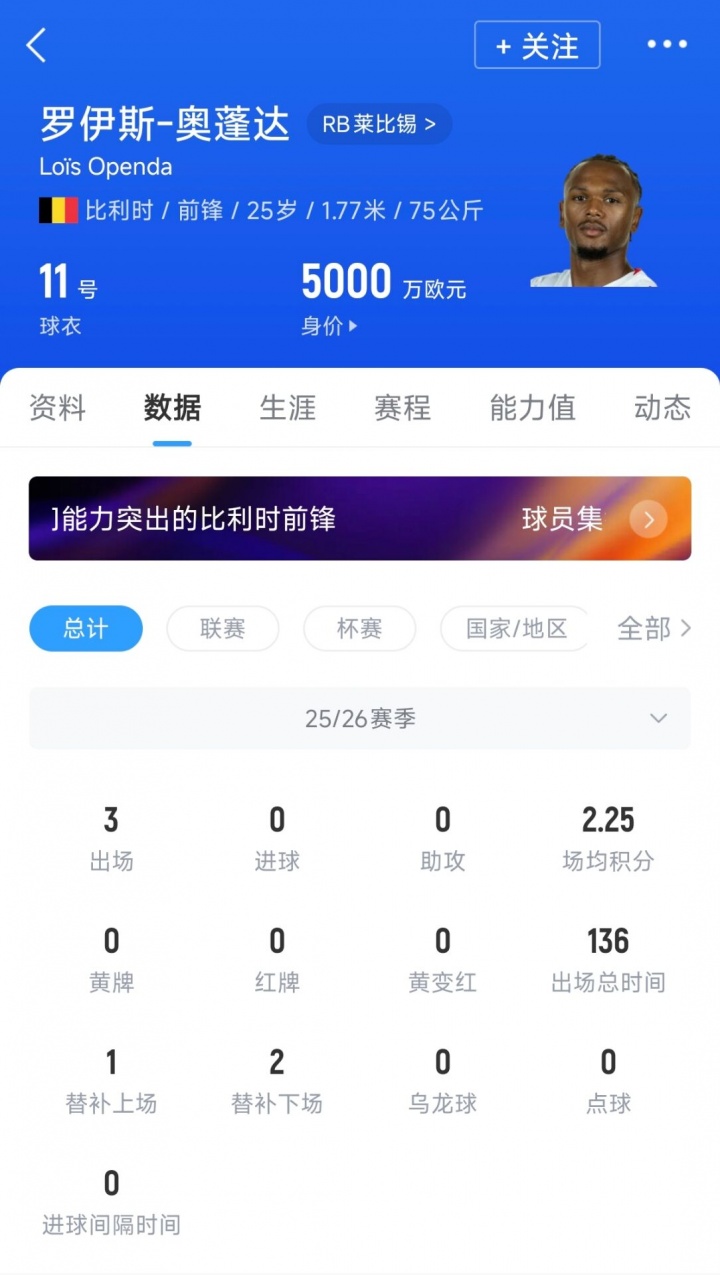 25岁的奥蓬达司职前卫,上赛季为莱比锡各项赛事45场13球7助攻,德回身价5000万欧元。