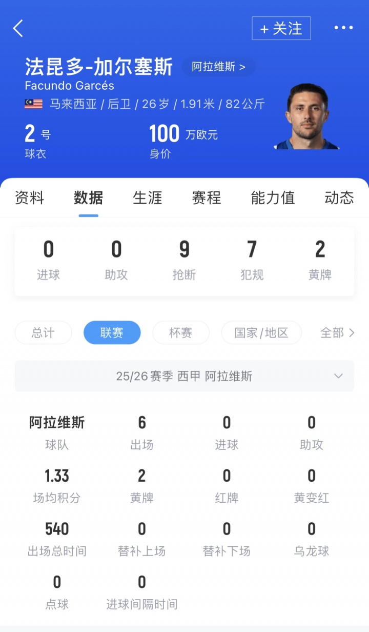 这其中就包括阿拉维斯中卫、26岁的法昆多-加尔塞斯(Facundo Garces)。加尔塞斯降生于阿根廷,本年1月肃肃加盟阿拉维斯,签约至2028年。本赛季西甲前6轮,加尔塞斯一起原发出场。