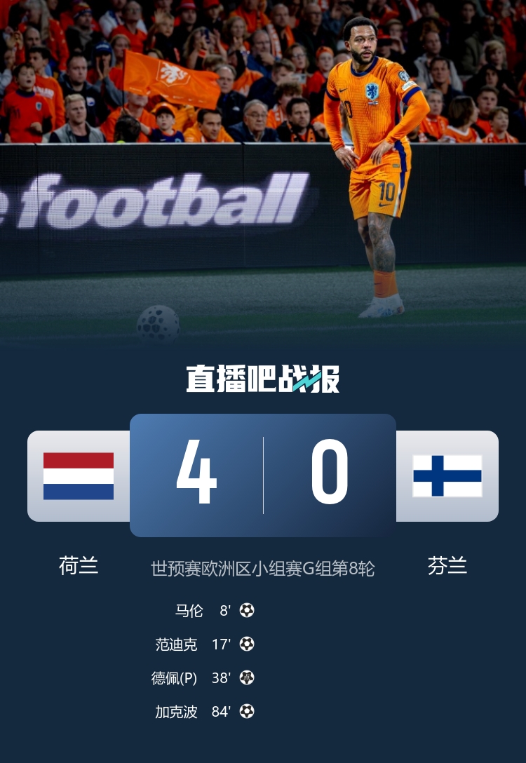 德佩点射+助攻双响,马伦宇宙波,范迪克、加克波立功;荷兰6轮不败领跑G组。