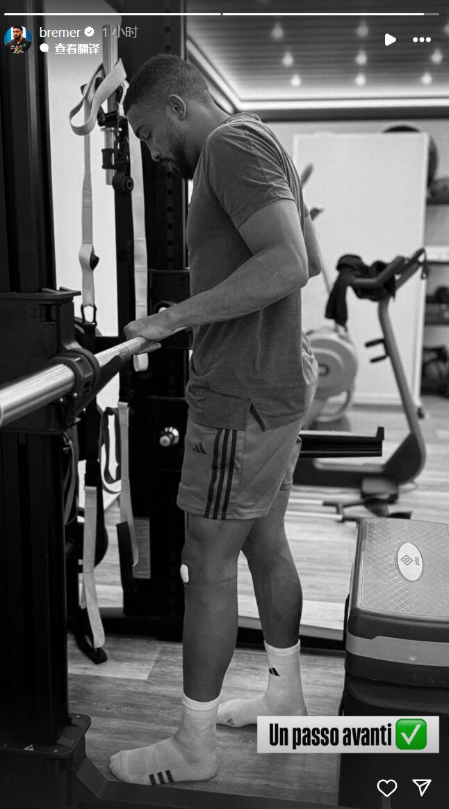 布雷默社媒晒图:身处健身房,正在进行规复性考试。相片的右下角配挑升大利语笔墨“Un passo avanti”,意为“上前一步”。