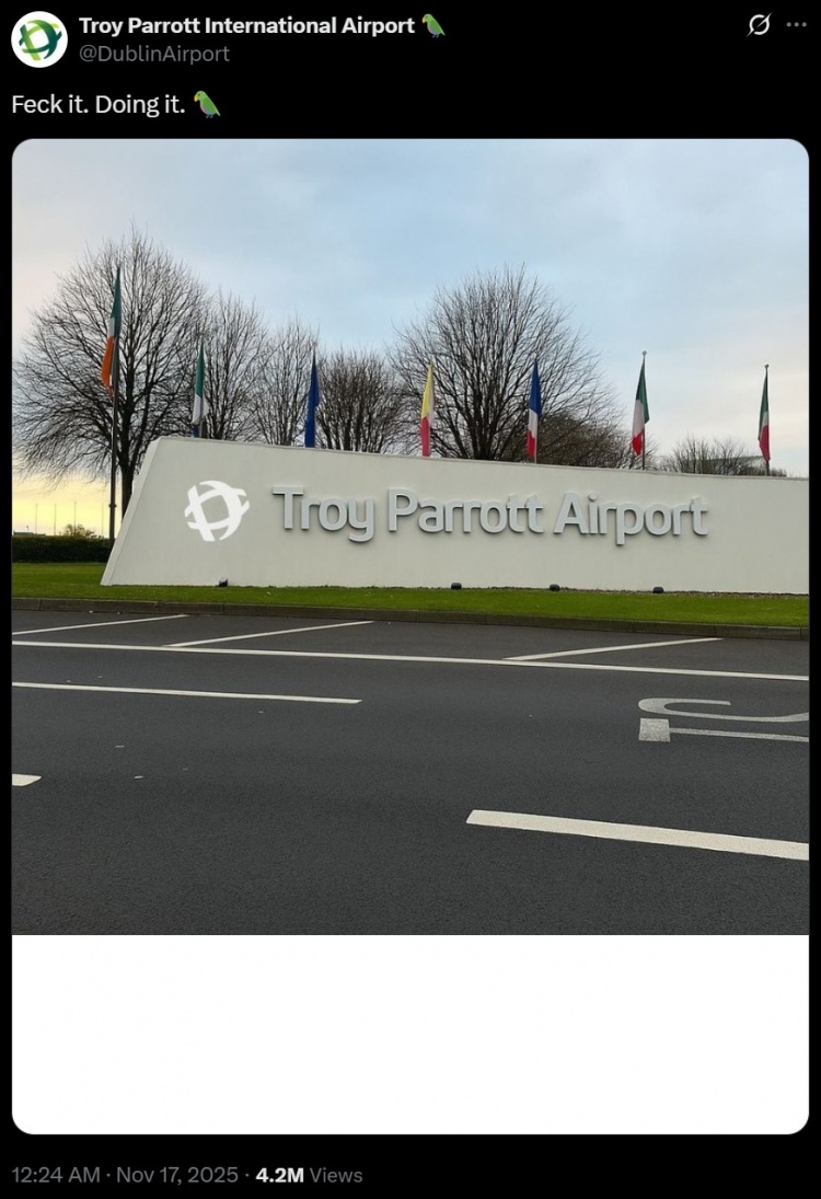 致意进球元勋!爱尔兰齐柏林机场将社媒账号改为帕洛特外洋机场