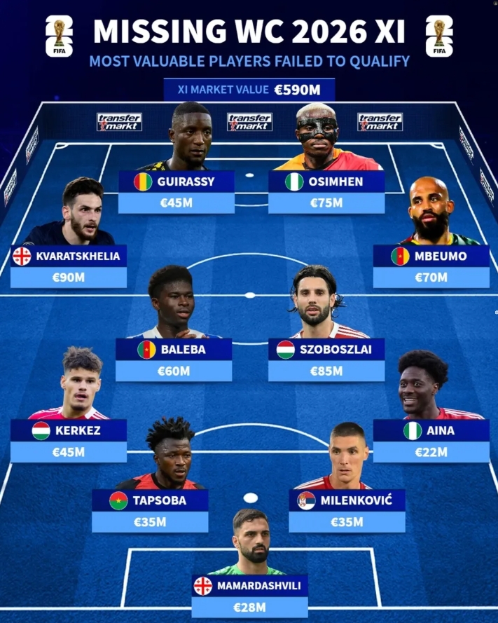 11月19日讯 本日德转社媒晒图,列出无缘2026宇宙杯球员中身价最高的首发声威,奥斯梅恩、姆伯莫、K77、索博斯洛伊等多名球星在列。