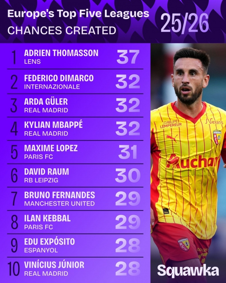 11月22日讯 五大联赛战火行将重燃,数据机构squakwa也统计了本赛季于今的五大联赛球员创造契机次数情况,朗斯中场阿德里安·托马森居首。