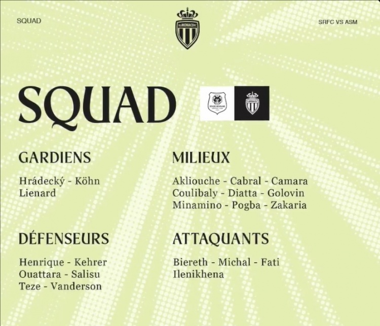 摩纳哥客战雷恩大名单:法蒂领衔,博格巴初次入选