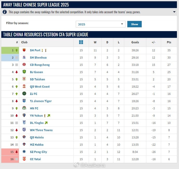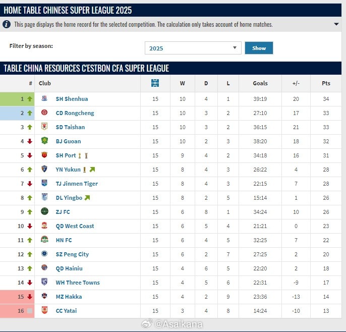 中超意念念积分榜:主场比赛积分榜&客场比赛积分榜
