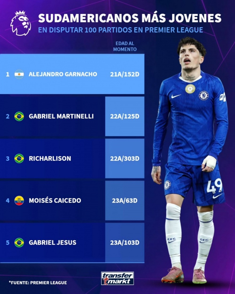 12月2日讯 德国转会市集统计了南好意思球员出战100场英超比赛的年事,比肩出最年青球员名次,加纳乔居首。