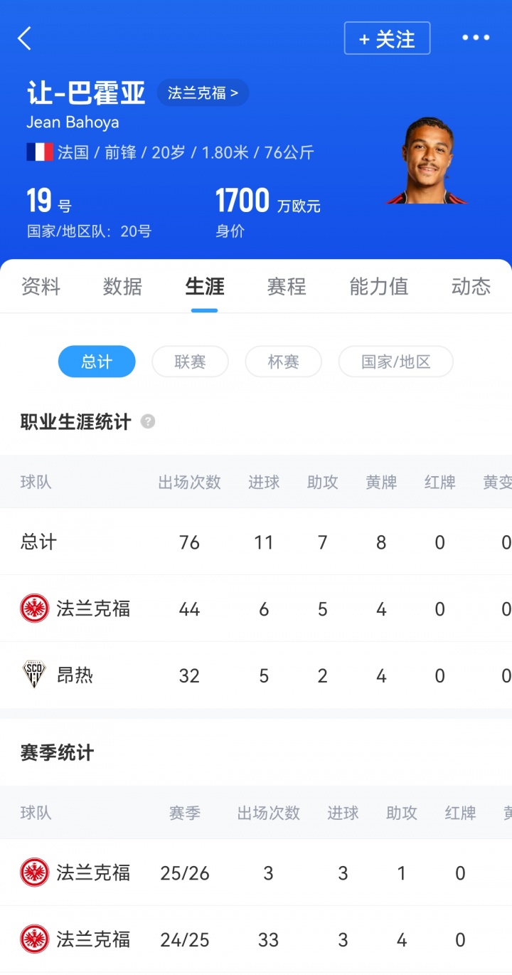 巴霍亚旧年冬窗800万欧元从昂热转会法兰克福,现在身价1700万欧元。图片报暗示,法兰克福里靠近巴霍亚的估值至少7000万欧元,以致达到8000万欧元。