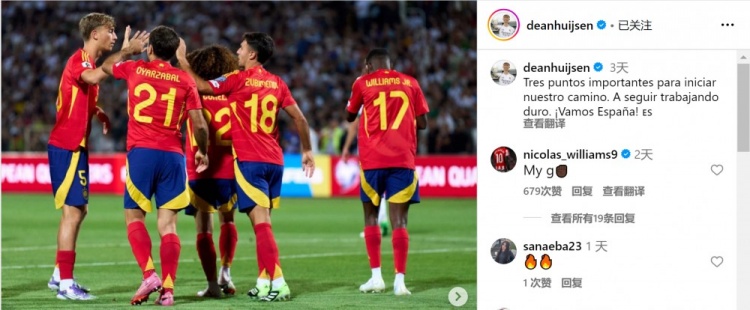 赫伊森社媒晒出比赛相片,配文:“开启世初赛征途的进攻三分,让咱们接续起劲,加油西班牙!”