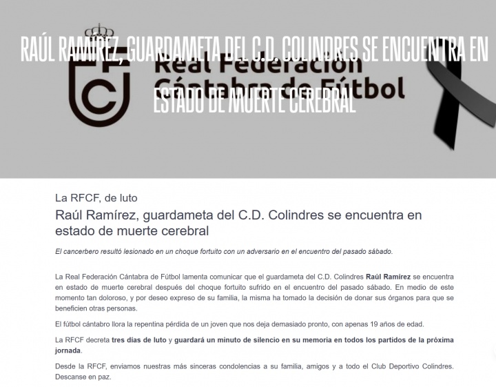 对科林德雷斯俱乐部19岁门将劳尔-拉米雷斯的磨灭深表追悼。