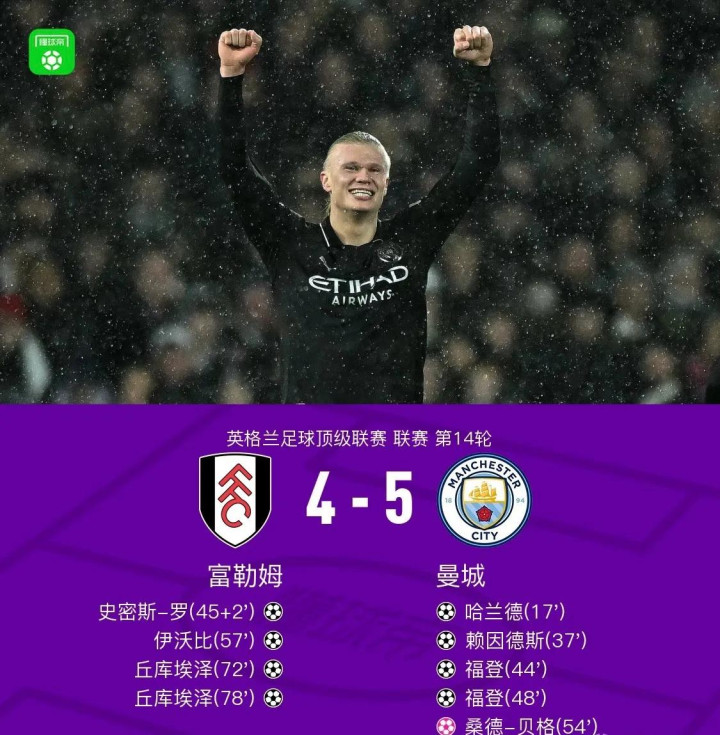 萨卡破门 曼城5-4险胜富勒姆 瓜帅吐槽媒体决议新征引更衣室争议