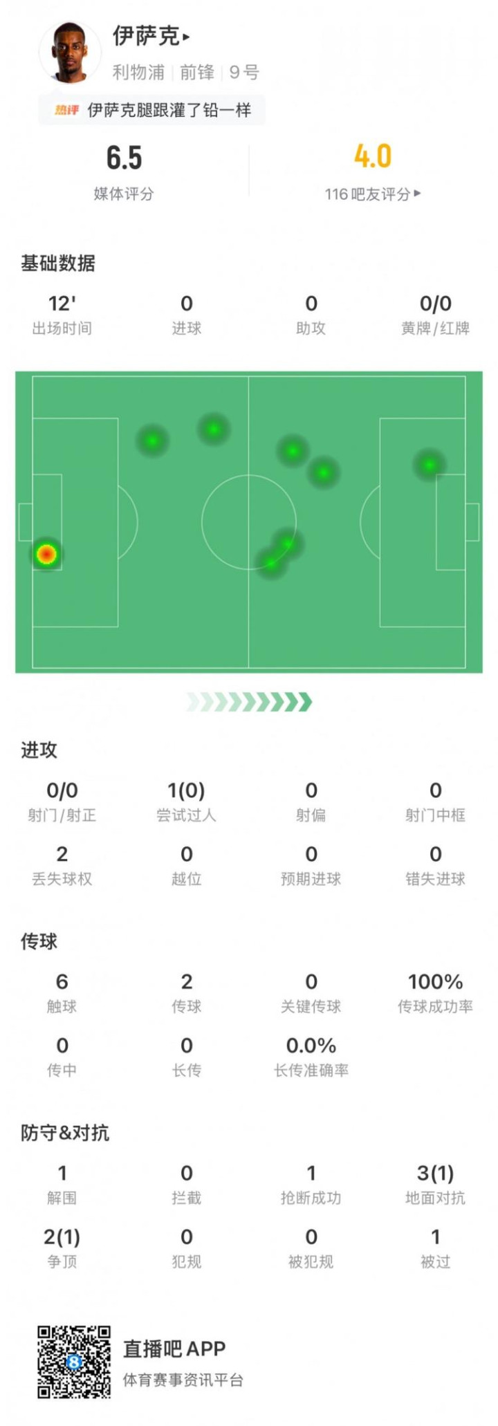 直播吧12月14日讯英超第16轮,利物浦主场2-0打败布莱顿,伊萨克鄙人半场替补登场,球员本场数据如下: