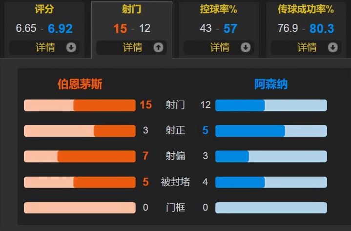 全场比赛,伯恩茅斯的控球率为43%,一共有15次射门,比阿森纳还多了3次,其中3次射正,比阿森纳少了2次。就数据来看,阿森纳客场逆转打败伯恩茅斯算是惊惶拿走3分。