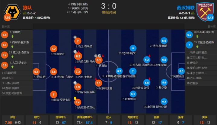狼队vs西汉姆联,爱德华兹排出352阵型,韩国国脚黄喜灿首发出战;努诺排出4231阵型,首发身价1.84亿欧元。此役狼队主场反击战尽头高效,半场就隔绝了接触,黄喜灿传射立功,赛后获取全场第二高分,8.1分;马特乌斯-马内造点+破门,赛后获取全场最高分,8.8分。英超副班长狼队一改纰谬,半场连入3球,打得西汉姆联找不到北。