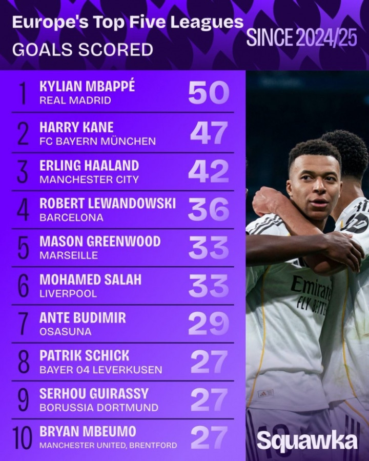 直播吧1月19日讯squawka统计了上赛季于今的五大联赛弓手榜情况,姆巴佩力压凯恩居首。