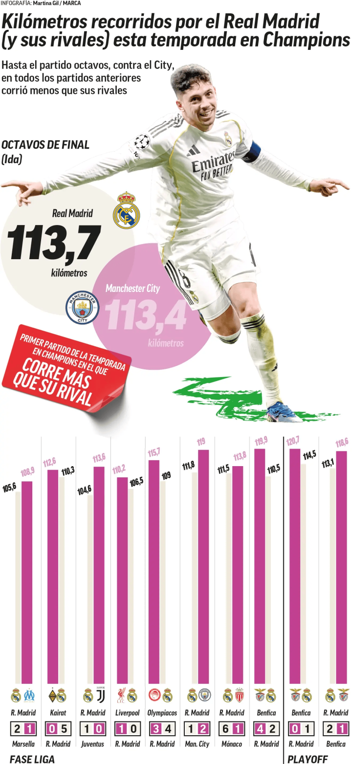 《马卡报》统计,本场对决皇马全队奔跑总距离达到113.7公里,在本比联赛季欧洲足球赛事杯中首次超过对手(曼城113.4公里)。相比去年12月欧洲足球赛事杯同样对阵曼城时的111.9公里,皇马在奔跑数据上明显进步。