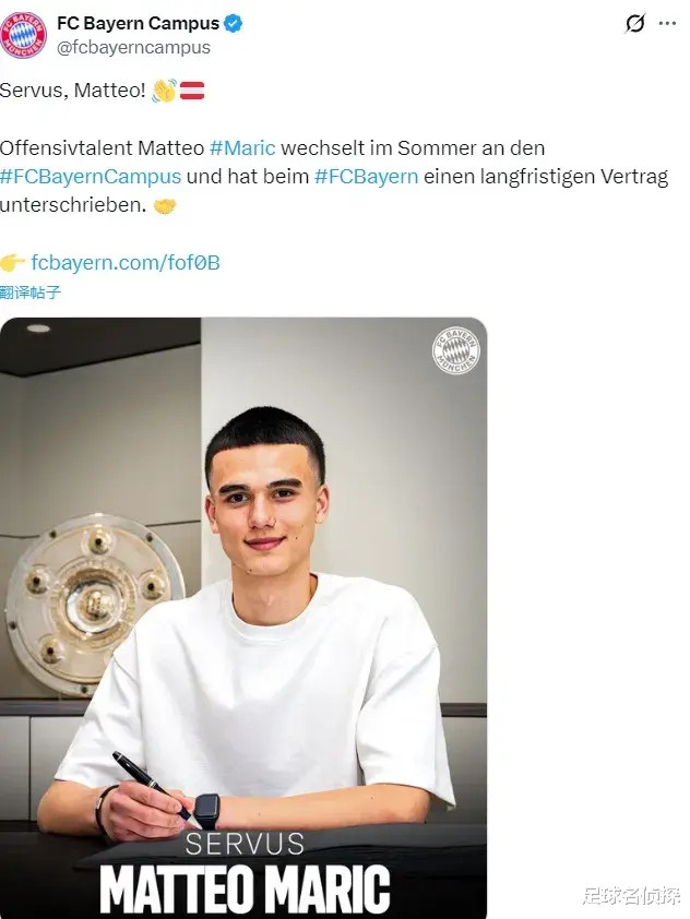 官方:拜仁宣布从萨尔茨堡红牛签下了新星马特奥-马里奇。