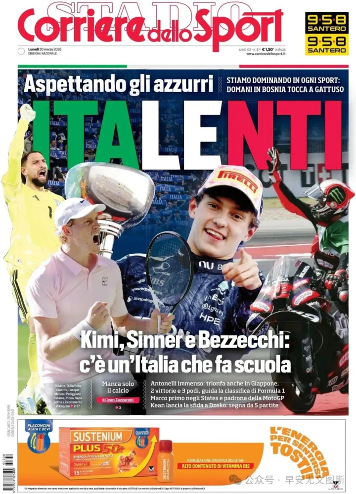 意大利:等待蓝衣军团,我们在其他所有运动活动 项目中都占据主导地位:明天轮到加图索的球队做客波黑。基米、辛纳和贝泽基,都有一个意大利人在统治赛事 。