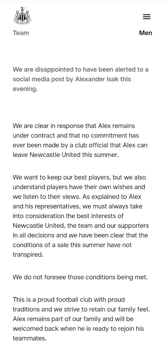 对于伊萨克的声明,纽卡斯尔官方刚刚也发布公开声明进行了复兴。具体如下↓