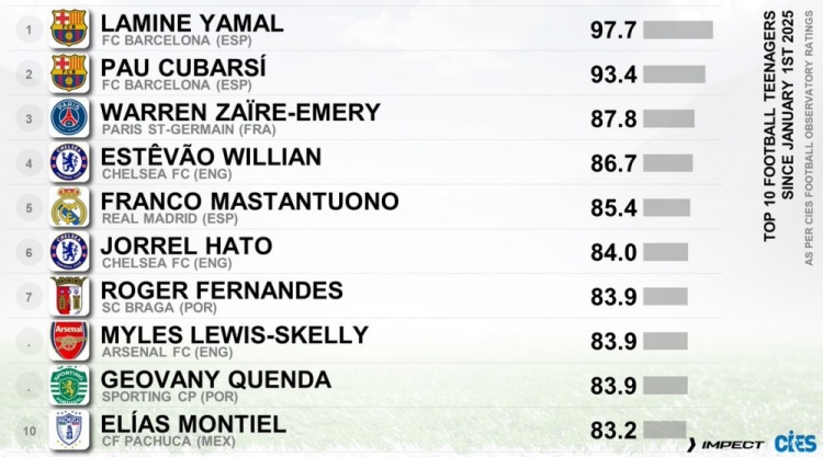CIES评本年非门将U20球员发达:亚马尔、库巴西前二,斯凯利在列