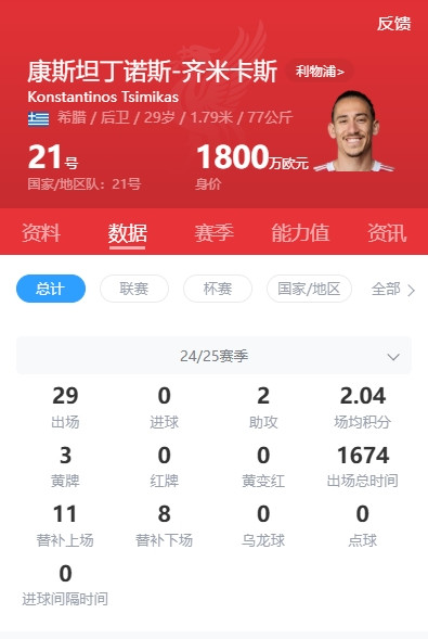 皆米卡斯现年29岁,上赛季为利物浦出场29场,现在身价1800万欧元。
