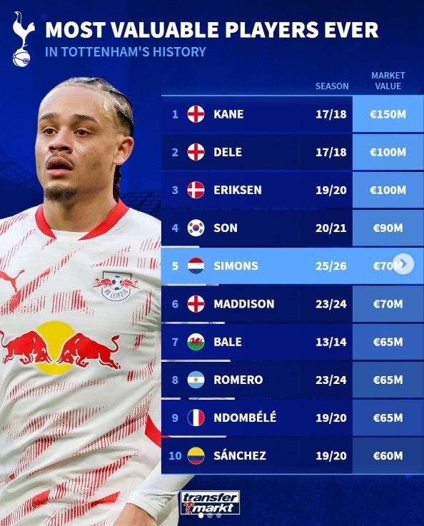 直播吧8月30日讯本周五,热刺官方告示以6000万欧元从莱比锡签下哈维-西蒙斯。笔据德国转会市集提供的数据,西蒙斯的身价为7000万欧元,在热刺队史足以排在第5位。