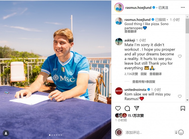 霍伊伦社媒晒建树穿那不勒斯球衣、面带笑貌的像片,配文:“还好我心爱披萨,我是那不勒斯东谈主。”