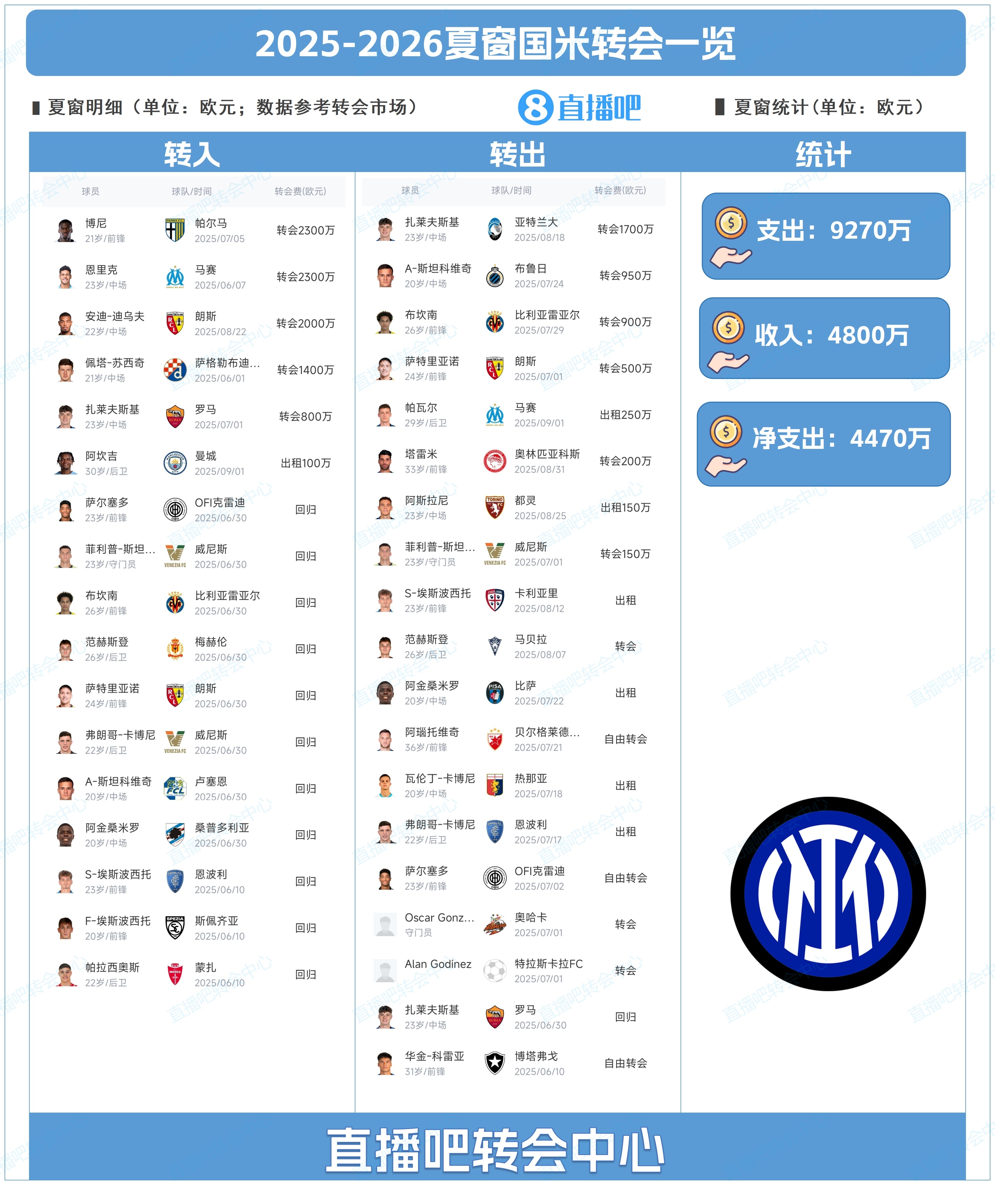 2:A-斯坦科维奇 中场 950万欧元 国米→布鲁日