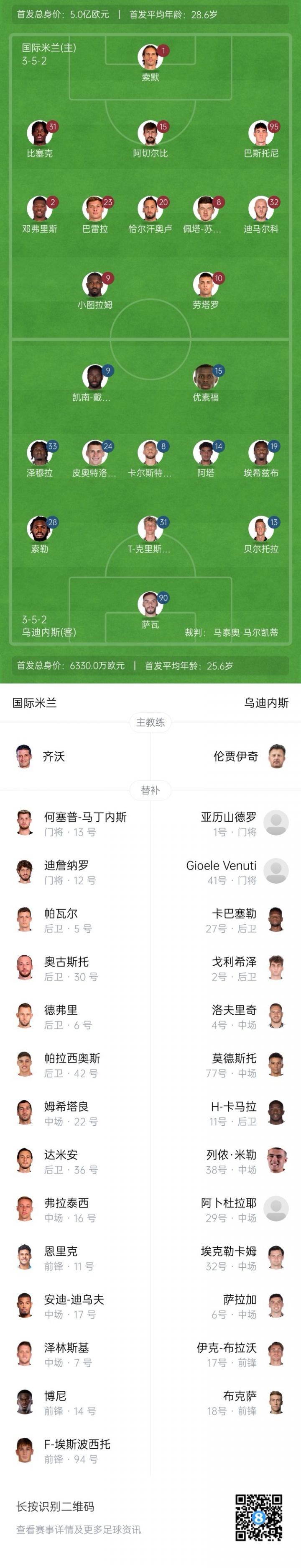 国米首发:1-索默、31-比塞克、15-阿切尔比、95-巴斯托尼、2-邓弗里斯、23-巴雷拉、20-恰尔汗奥卢、8-佩塔-苏西奇、32-迪马尔科、9-小图拉姆、10-劳塔罗