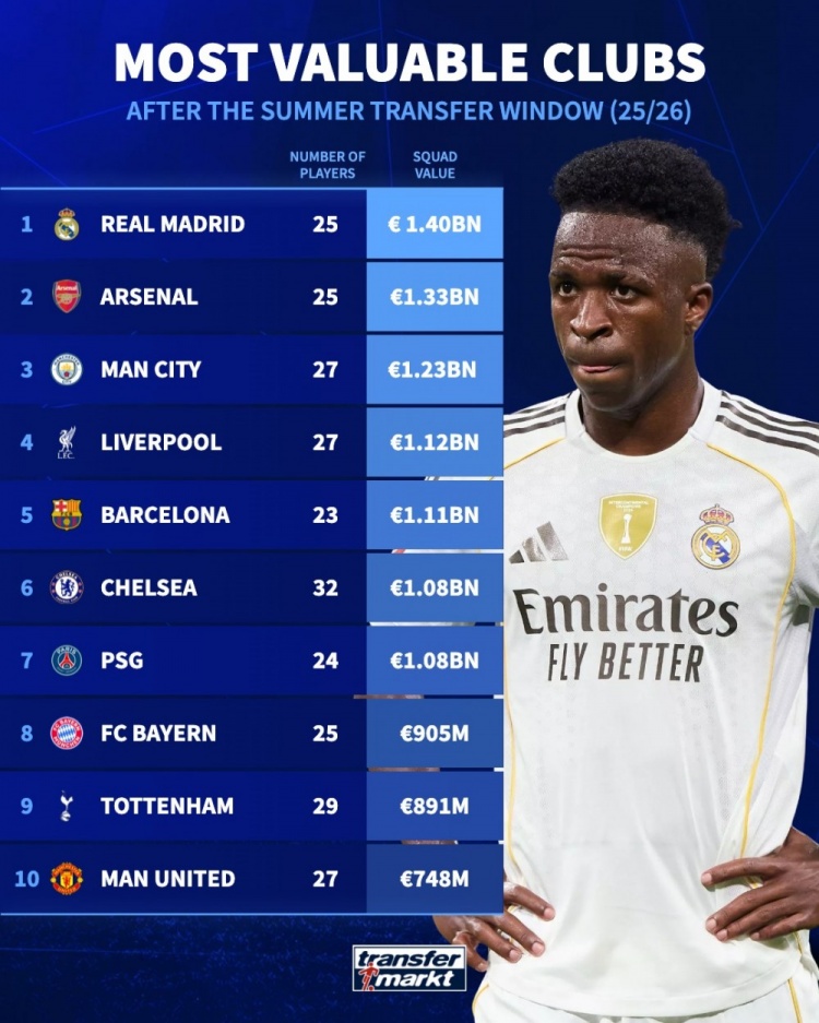 关窗后球队身价排行:皇马14亿欧居首,枪手、曼城前三&曼联第10