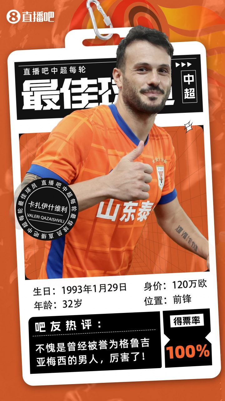 再次感谢卡扎伊什维利和山东泰山足球俱乐部关于中超每轮最好球员评比行动的狂放营救。