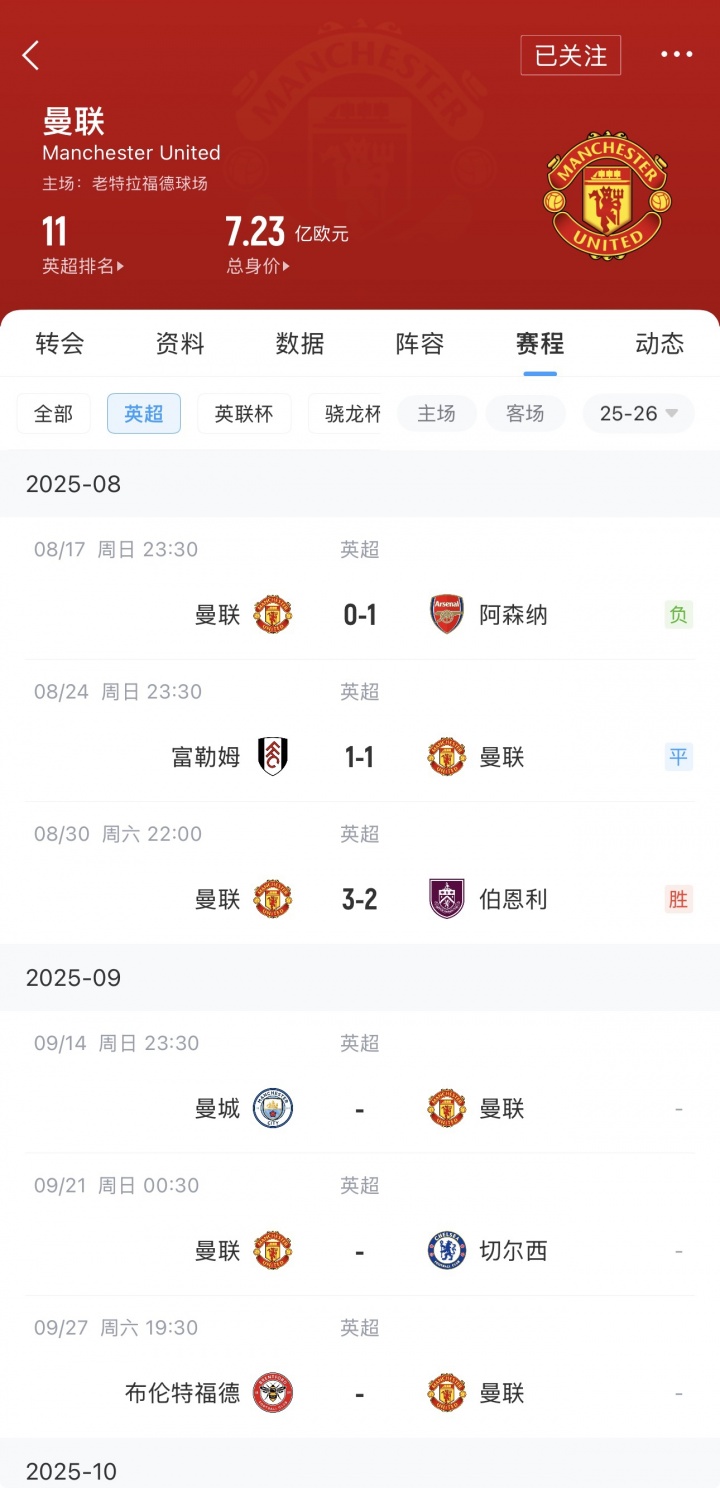 阿莫林帅位危?曼联开赛1胜1平2负4分名按序14,下轮主场战切尔西